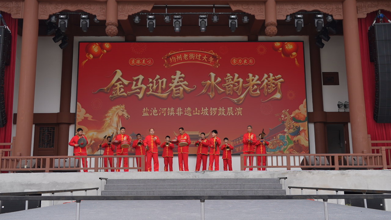 2月26日下午,丹江口市均州老街锣鼓喧天、年味十足,盐池河镇非遗山坡锣鼓展演在此精彩上演。当地非遗传承人与文艺爱好者同台献艺,以铿锵鼓点展现乡土非遗魅力,吸引市民和游客驻足观赏,现场掌声不断。